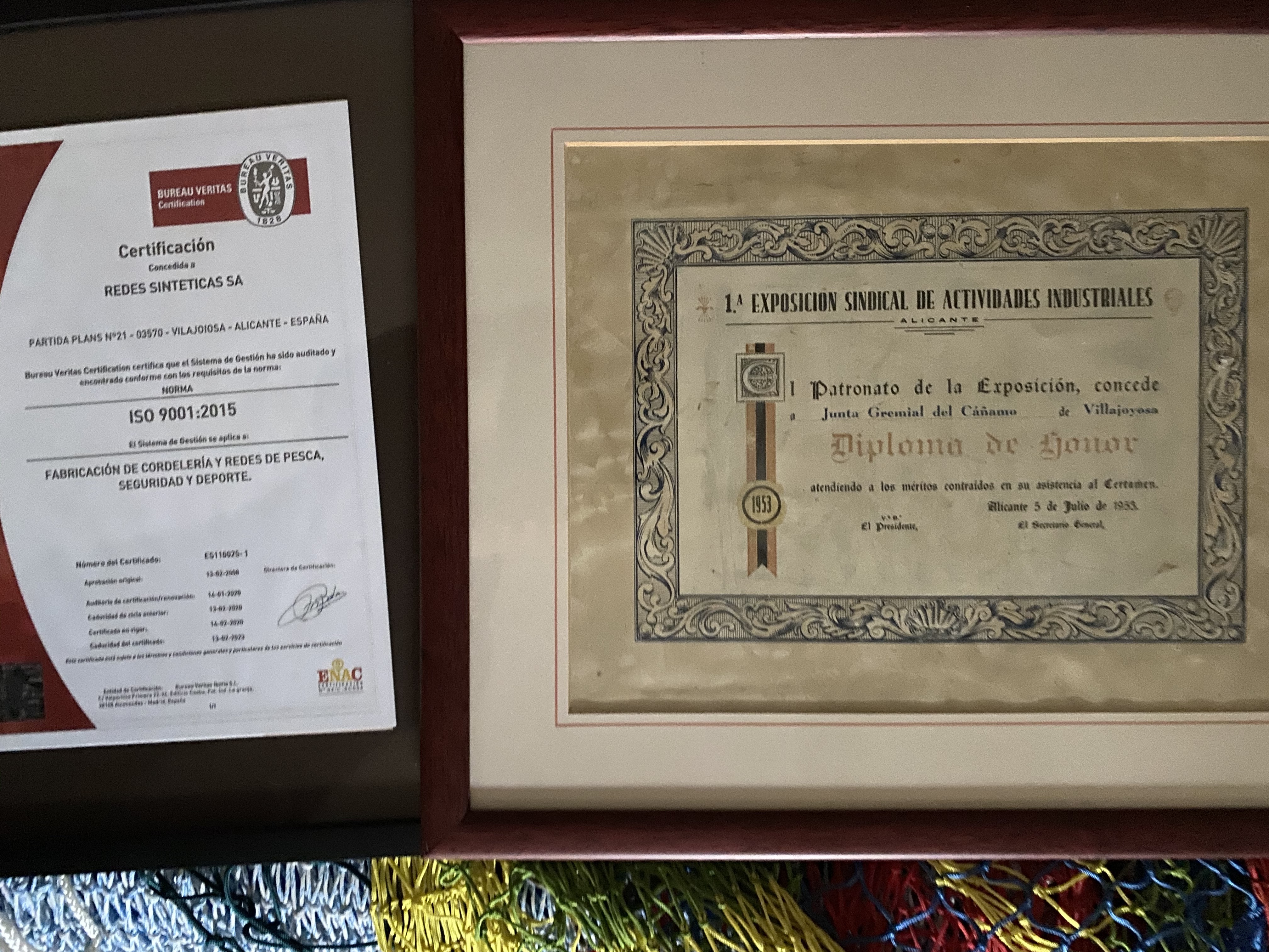 Más de 240 años fabricando redes y cordelería son una garantía y un aval para nuestros productos. En el año 1.953 se nos concedió el Diploma de Honor de Fabricación en la 1ª exposición de actividades industriales que se hizo en la Provincia de Alicante. Y desde diciembre de 2004 hasta la actualidad, el proceso de fabricación esta certificado por Bureau Veritas, bajo la norma de calidad UNE-EN-ISO 9001:15.